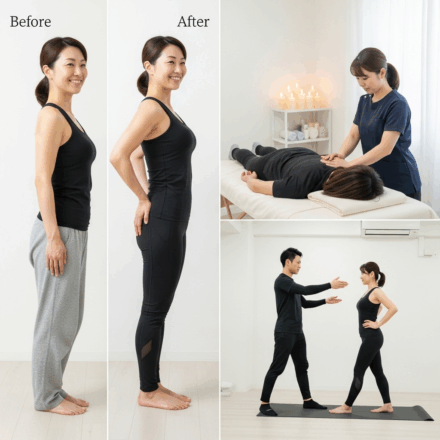 センスではまず骨格の位置を整体で整えたうえで、深層筋を使って安定させ、日常の動きが“ラインを育てる時間”になるよう導きます。