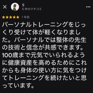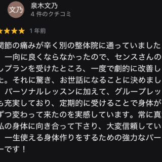 100歳まで元気に動ける身体を目指して SENSEのパーソナルトレーニングをじっくり受けていくうちに、気づけば体が本当に軽くなっていました。 整体の先生の技術力と、"一生使える身体をつくる"という信念に心から共感しています。目先の変化だけで...