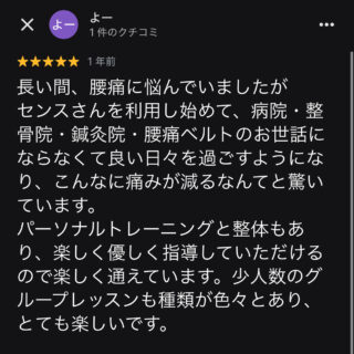 長年の痛みから解放され、楽しく通える毎日へ 長い間ずっと腰痛に悩まされていて、病院・整骨院・鍼灸院・腰痛ベルトと、ありとあらゆるものに頼ってきました。 でも、センスさんに通い始めてからは、気づけばそれらに頼らなくても快適に過ごせる日々が戻っ...