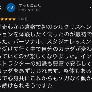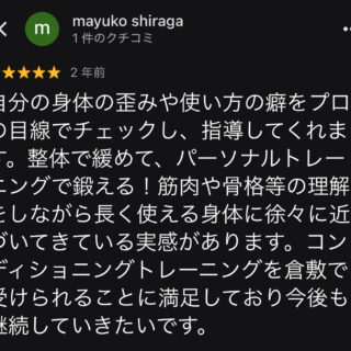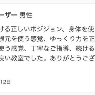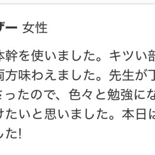 予想以上に体幹をしっかり使うことができ、キツい部分もありましたが、それ以上に楽しく充実した時間でした。先生の丁寧な説明のおかげで、身体の使い方についてとても勉強になりました。ぜひまた受けたいです。本日は本当にありがとうございました!