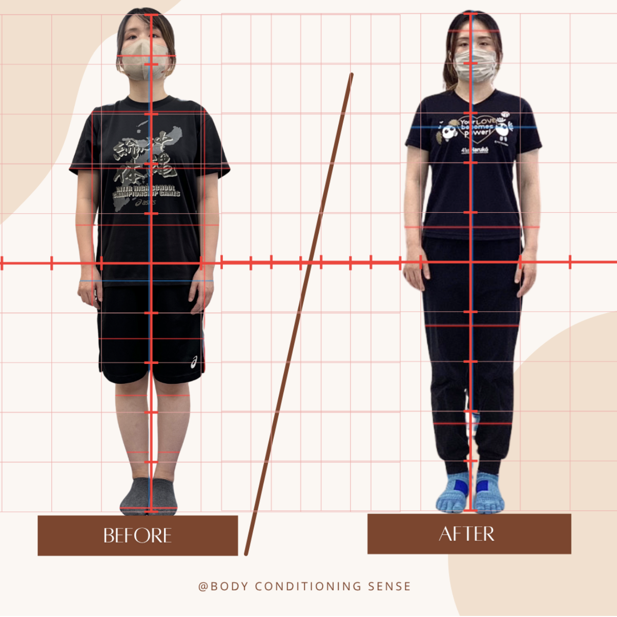 センスでは毎回、骨格と姿勢の状態を確認し、定期的なビフォーアフター撮影で変化を“見える化”。