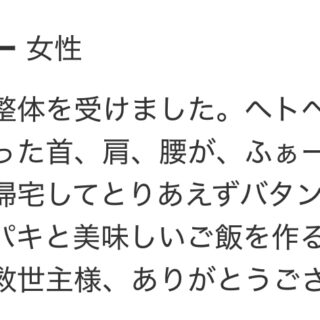 仕事帰りでヘトヘト、首・肩・腰もガチガチに凝っていたのですが トレーニングを受けて「ふぁーっ」と全身が軽くなりました。 普段なら帰宅してバタンキューのはずが、その日はテキパキと動けて、美味しい夕飯まで作れたんです!まさに私の救世主です。あり...