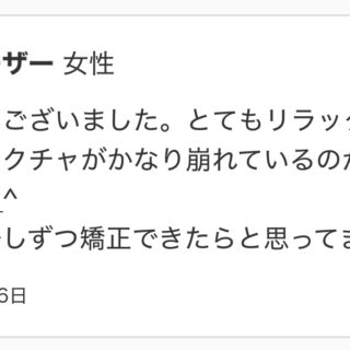 とてもリラックスできる時間の中で、自分の体のストラクチャがかなり崩れていることに気づけました。無理なく少しずつ矯正していけそうで、これからが楽しみです。